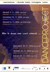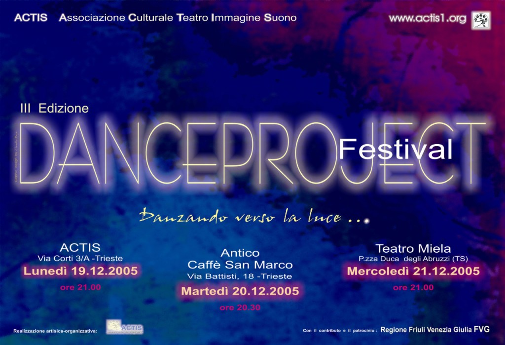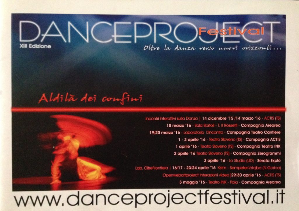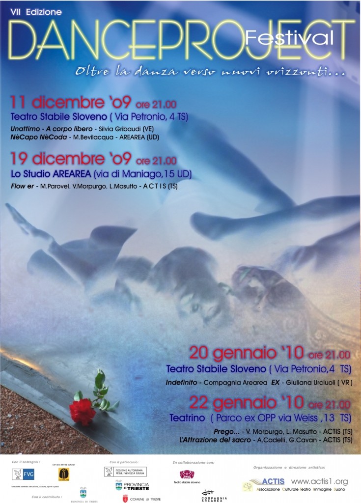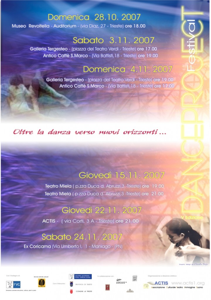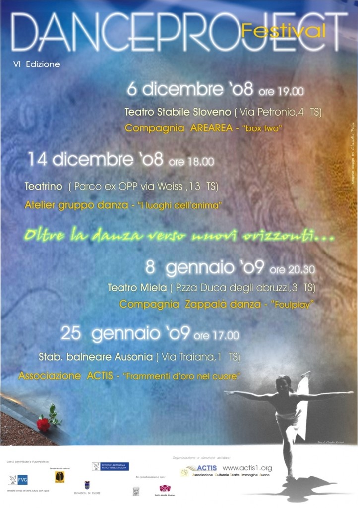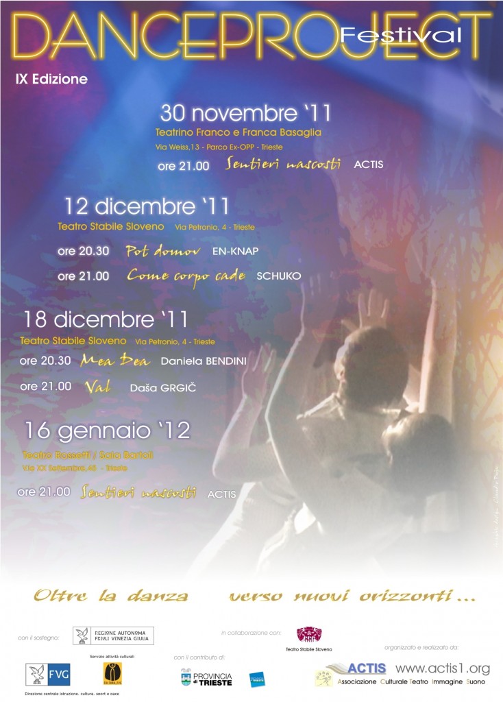 La XII edizione della manifestazione Danceproject Festival organizzata, con il contributo della Regione FVG, dall’Associazione Culturale Teatro Immagine Suono – ACTIS di Trieste, avrà inizio nella seconda metà di dicembre e quest’anno verrà attuata una trasversalità più precisa tra la danza contemporanea, il teatro e gli eventi multimediali, verterà su tematiche relative ai valori etici e sociali in una società in crisi e profondo cambiamento.