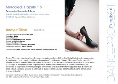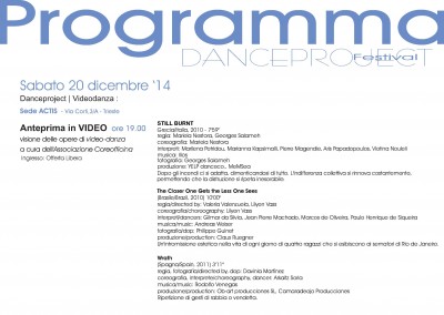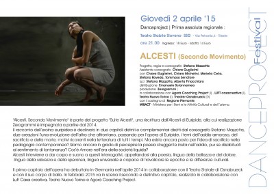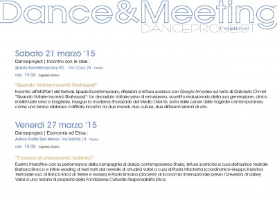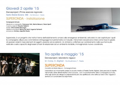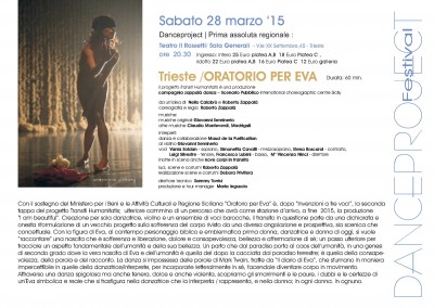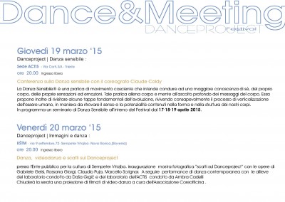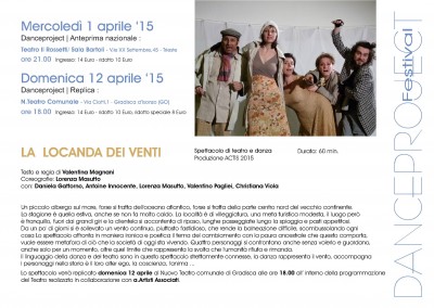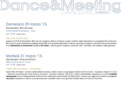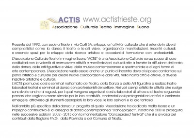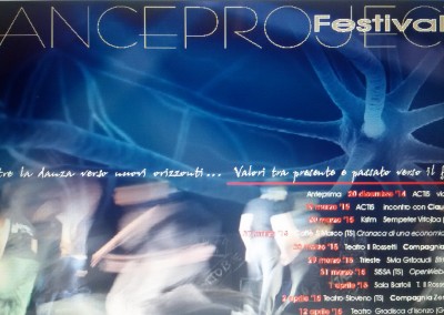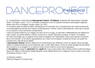 La XII edizione del Danceproject Festival, organizzata, con il contributo della Regione FVG, dall’ ACTIS Associazione Culturale Teatro Immagine Suono di Trieste, attua quest’anno una trasversalità più precisa tra la danza contemporanea, il teatro e gli eventi multimediali e verte su tematiche relative ai valori etici in una società in profondo cambiamento. La manifestazione è caratterizzata infatti da eventi con partecipazione diretta delle persone, laboratori creativi e momenti di confronto e dibattito. Con il mese di marzo, dopo l’anteprima di dicembre, il Festival entra nel vivo. La Compagnia Shuko di Milano propone un laboratorio di danza rivolto ai ragazzi della scuola media Dante di Trieste sul tema dell’acqua e delle emergenze ad essa legate. Il 14 e 15 marzo presso la sede dell’ACTIS ci sarà un seminario di Play Back Theatre sul tema dei valori; dal 20 al 22 marzo si svolgerà anche un percorso formativo sull’immagine Mindfull Vision con Izabela Jaroszewska. Dal 23 al 29 marzo l’Ass. Zebra con la danzatrice Silvia Gribaudi si rivolgerà alle donne over 60 con un laboratorio atto a dare risalto al corpo come strumento espressivo al di là degli stereotipi: verrà quindi realizzata una performance “Blitz Over ’60” presso una sede COOP di Trieste. Il 19 marzo presso la sede dell’ACTIS il coreografo Claude Coldy terrà un incontro con il pubblico per spiegare la danza sensibile, metodo creato da lui stesso. Dal 17 al 19 aprile avrà poi luogo un seminario ad Ankarano. Il 20 marzo presso lo spazio di Sempeter Vrtojba (Nova Gorica) verrà allestita una mostra fotografica sul Festival e verranno proiettati lavori di video danza a cura dell’Associazione Coreofficina, seguiranno delle performance di danza. Il 27 marzo, in collaborazione con Banca Etica, “Cronache di un’economia ballerina” presso l’Antico caffè San Marco: evento interattivo con la performance della compagnia Shuko, reading a cura dell’autrice teatrale Barbara Sinicco e infine intervento del prof. Paolo Ermano sul tema “valori ed economia”. Il 28 marzo, presso la Sala Generali del Teatro Stabile FVG, la Compagnia Zappalà di Catania presenta l’opera in prima regionale “Oratorio per Eva”. Il 31 marzo, presso la SISSA di Trieste, “Open Web Art Project”, evento multimediale tra danza video e web a cura di Izabella Jaroszewska; a seguire un dibattito su scienza e valori a cura dei ricercatori della SISSA. L’1 aprile, alla sala Sala Bartoli del Rossetti, “BodyunTitled” di e con Daša Grgič, a seguire prima nazionale dello spettacolo ironico e surreale di teatro e danza “La locanda dei venti” produzione ACTIS, testo e regia di Valentina Magnani, che verrà replicato il 12 aprile a Gradisca. Il 2 aprile,al Teatro Stabile Sloveno, “Alcesti” della compagnia Zerogrammi di Torino sulla figura femminile raccontata da Euripide. All’entrata del teatro installazione multimediale “Super onda”. Le notizie e gli aggiornamenti sul Festival si potranno trovare presso lo spazio Econtemporary di Elena Cantori.